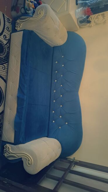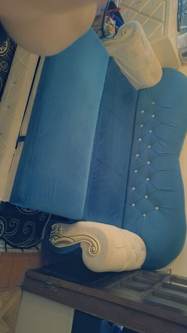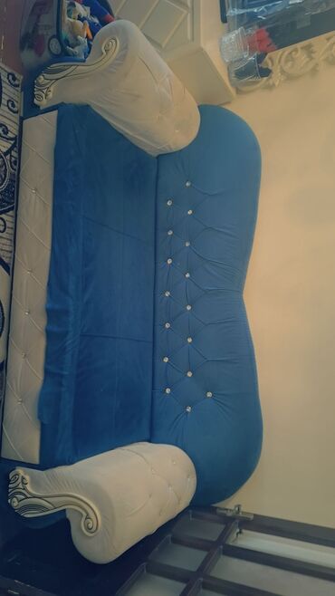 Məhsullar: 1) Klassik üslublu divan - Rəng: mavi oturacaq və arxa hissə, krem/qırıq-ağ yan və qol hissələr - Qollarda dekorativ oyma naxışlar - Arxa hissədə kapitone (düyməli) işləmə, parlaq bəzək...