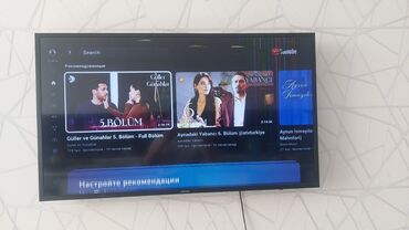 Samsung Smart TV və pult - Ekran ölçüsü: təxminən 40–43 düym - Smart TV funksiyaları: Netflix, Divan.TV, veb-brauzer, tətbiqlər paneli, canlı TV bölməsi görünür - Quraşdırma menyuları və ekran kla...