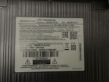 Model kodu etiketdə: UE55RU7470UXRU; seriya nömrəsi və digər texniki göstəricilər arxa etiketdə göstərilib. Divara asmaq və ya dayağa quraşdırmaq üçün uyğundur. 55 düymlük geniş ekran, 4K məzmun üçün ideal.