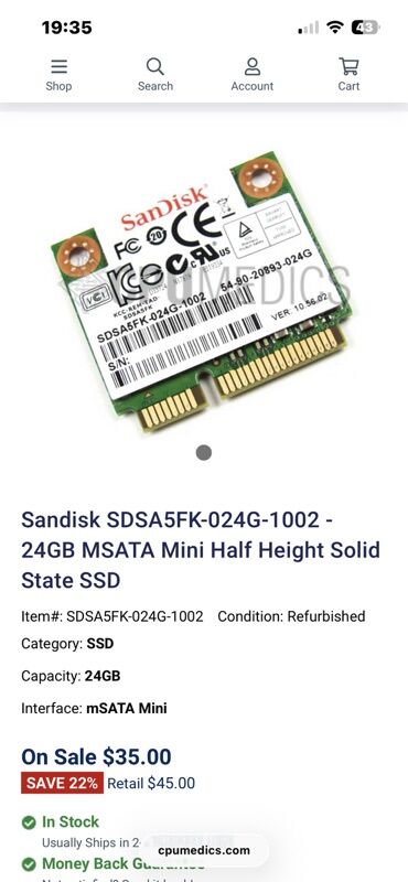 İşlənmiş✅Original SanDisk mSATA 24 GB. Üstən çıxmadı. Tam işlək vəziyyətdə. SSD yaddaşdı.