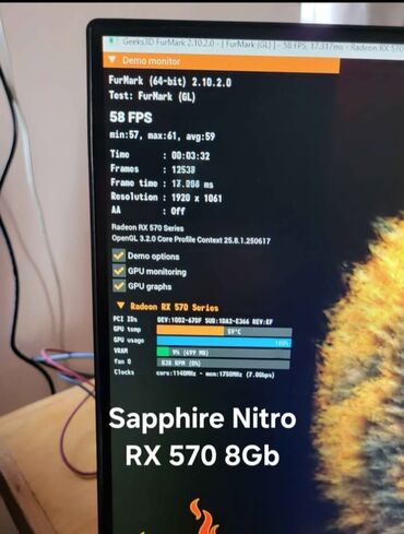 - Şəkillərdə real qurğu və FurMark göstəriciləri təqdim olunub: “Sapphire Nitro RX 570 8Gb”.
