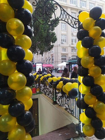 OBYEKT AÇILIŞI DEKOR ŞARLAR Qara-sarı rəng palitrasında bəzədilmiş hava şarı dekoru və giriş dizaynı xidməti.
