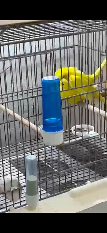 Parlaq sarı rəngli kanareyka və qəfəs dəsti. Xüsusiyyətlər: - Növ: Kanareyka (sarı rəng dominant, bədənin tamından tünd olmayan, parlaq lələklər) - Rəng: Canlı limon-sarı - Qəfəs: Mavi rəngli meta...