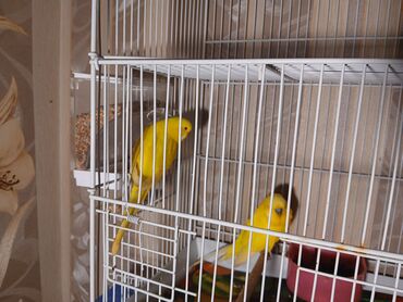 Rəngarəng kanareykalar və qəfəslər - Sarı və ağ tonlarda kanareykalar – müxtəlif sayda quş bir neçə qəfəsdə. - Üst hissədə 2 ədəd orta ölçülü qəfəs: biri yaşıl altlıqlı, digəri qırmızı altlıqlı. H...
