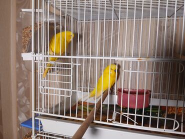erkeyler 1 ed 70m Təsvir: - Parlaq sarı rəngli bir neçə kanareyka - Ağ metal qəfəs, qırmızı altlıqla - İçliklər: taxta tünekələr, iki tərəfli yemi qabları, su qabı - Ön hissədə çıxarılan yem qabı ...