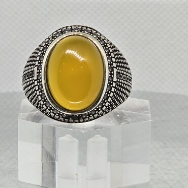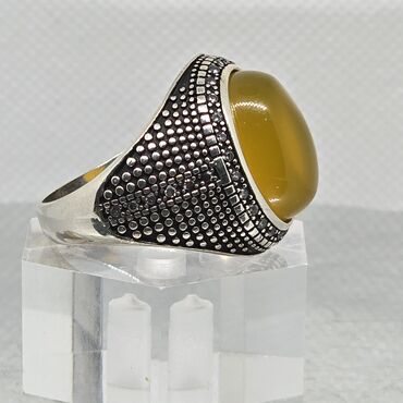 Digər növGümüşdən hazırlanmış 925 prob Tebii sarı əqiq daşlı kişi üzüyü. Üzüyün ətrafı xırda daşlarla bəzədilib. Zərif dizaynı ilə diqqət çəkən bu üzük, həm gündəlik, həm də xüsusi günlər üçün əla seçimdir.