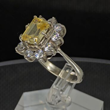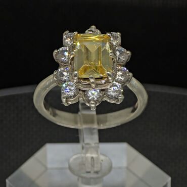 Mərkəzində baget formalı sarı daş və ətrafında kiçik, yuvarlaq şəffaf daşlar olan gümüş 925 prob üzük. Mərkəzi daşın kəsiyi və parlaqlığı diqqəti cəlb edir, ətrafdakı kiçik daşlar isə əlavə parıltı verir. Üzüyün incə dizaynı onu gündəlik istifadə üçün münasib edir. Moskva zavod Tek ekzemplyarda di