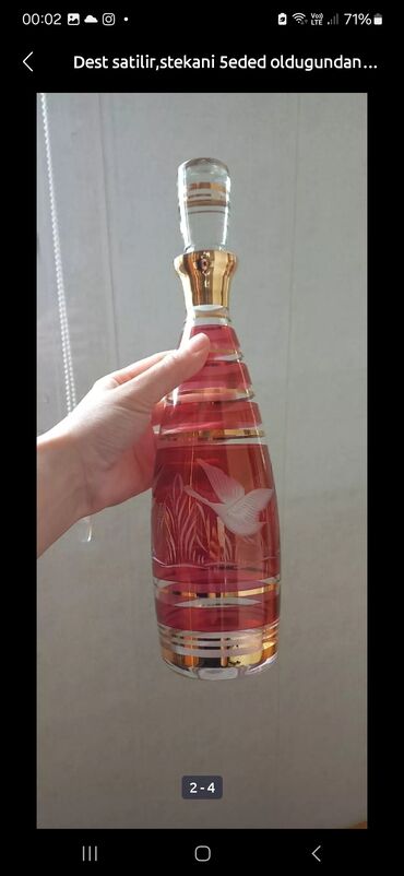 Qızılı naxışlı şüşə dəst - Material: qalın, şəffaf şüşə, üstü qızılı rəngli dekor və gül ornamentləri - Rəng: bal-şərab tonlarında şüşə, parlaq qızılı haşiyələr - Dəst tərkibi: - 2 ədəd tıxaclı ...