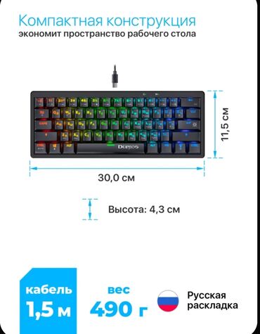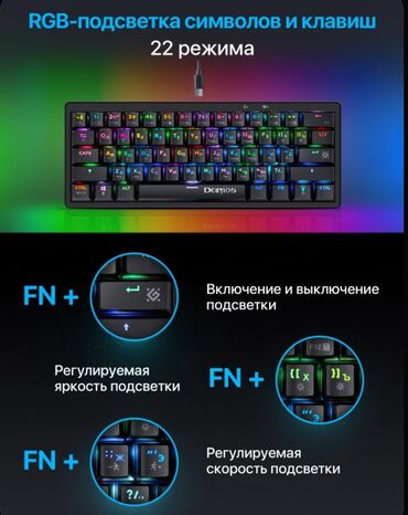 RGB işıqlı kompakt mexaniki klaviatura - 60% ölçülü layout: oxlar və numpad olmadan, masa üzərində minimum yer tutur. - USB kabel ilə qoşulma (şəkildə mövcud kabel). - Tam rəngli RGB arxa işıqland...