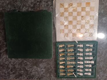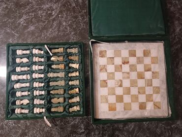 Mərmər/Oniks şahmat dəsti - Taxta: ağ və zeytun-yaşılı tonlarda mozaika şəklində yığılmış cilalı daş kvadratlar (mərmər və oniks teksturalı). - Fiqurlar: iki rəng dəsti. - Ağ komanda — parlaq ağ...