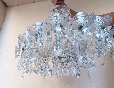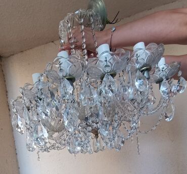 Dekorativ tavandan asılan işıqlandırma lüsturları və asqılar dəsti - Kristallı, çoxqatlı şaxəli iri lüster: qızılı metal karkas, damcı formalı kristal asqılar, güclü işıq yayımı üçün çoxsaylı E14/...