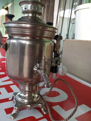 80 ci illərin elektrik samovarı. Tutumu 3,5 l. Gümüşü rəngdə, klassik dizaynlı samovar. Üç ayaqlı dayaq üzərində möhkəm dayanır. Yan tərəflərində tutacaqları var.