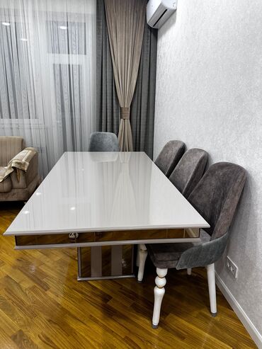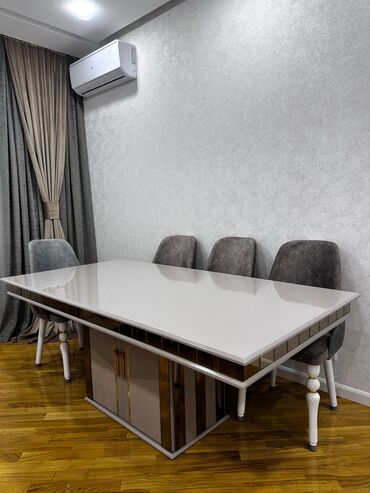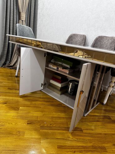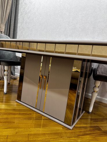 - Masa: parlaq krem-ağ rəngli, düzbucaqlı üst səth; kənarlarda dekorativ güzgü zolaqları. Mərkəzi dayaq hissəsi iki qapılı şkaf formasındadır – içərisi rəflidir, süfrə, qab-qacaq və digər əşyalar üçün geniş saxlama yeri yaradır. Qapılar rəfli, qızılı tonlarda tutacaqlarla. Stabil altlıq, möhkəm konstruksiya.
