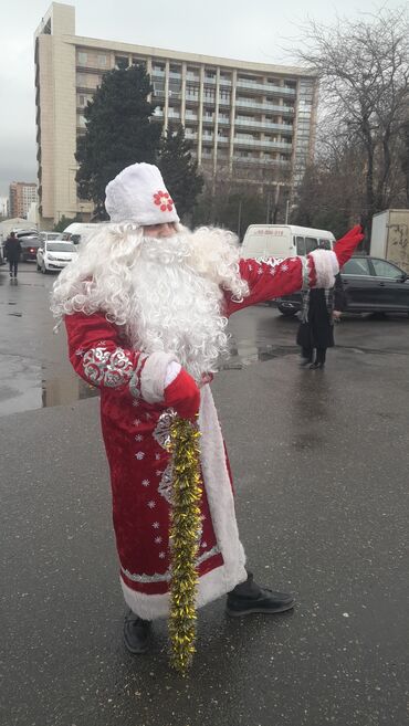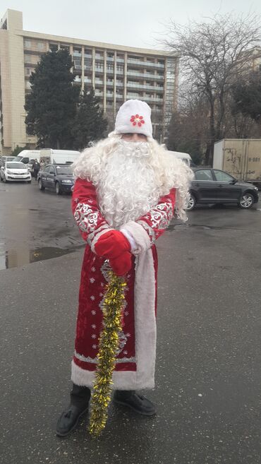 - Tam kostyumlu Şaxta Baba obrazı: qırmızı məxməri naxışlı uzun plaş, ağ süni xəz haşiyələr, matching papaq, uzun ağ saqqal-parik komplekti, qırmızı əlcəklər.