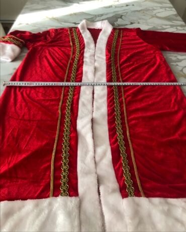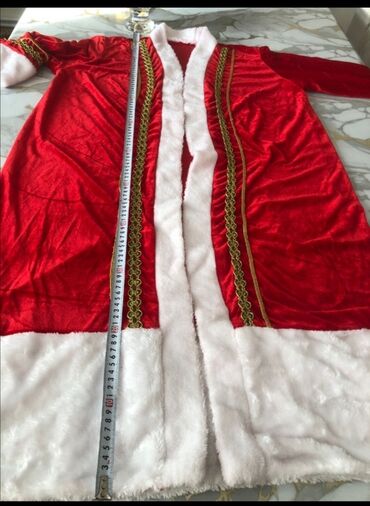 - Qırmızı məxməri parça, ağ süni xəz haşiyələr və qızılı bəzək lentləri