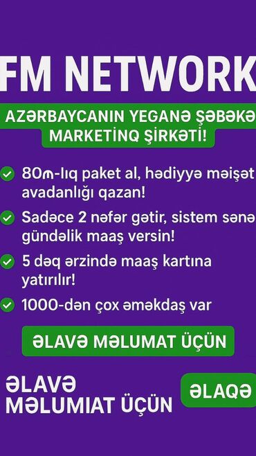 FM NETWORK – şəbəkə marketinqi üzrə biznes imkanı - Azərbaycanda fəaliyyət göstərən FM şirkəti: real qazanc imkanı verən, binar sistem üzərində qurulmuş müasir biznes modeli. - Günə 30 AZN-dən 105...