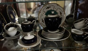 - Zərif qızılı bordürlər və dərin lacivərt emal vitrin parıltısı ilə