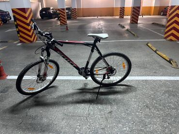 Dağ velosipedi – 26” təkərlər, disk əyləclər, amortizatorlu ön “fork”. - Çərçivə: yüngül və möhkəm alüminium tipli çərçivə, qara rəngdə mavi-qırmızı detallar. - Təkərlər: 26 düym dişli (off-road) ...