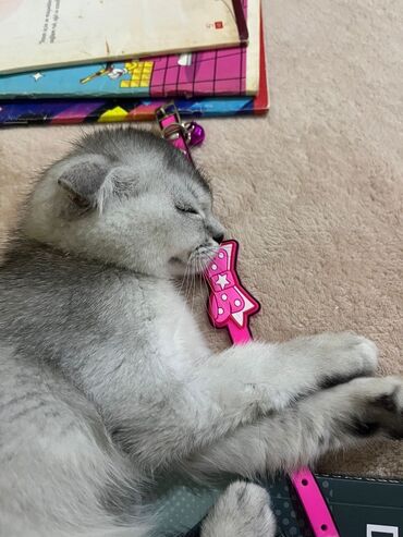 Skotiş Fold (Scottish Fold) bala pişik - Rəng: vahid boz (blue/grey), qısa, sıx və ipək kimi yumşaq tüklər - Qulaqlar: tipik “fold” – irəliyə doğru yığılmış - Gözlər: iri, kəhrəba tonlarında, ifad...
