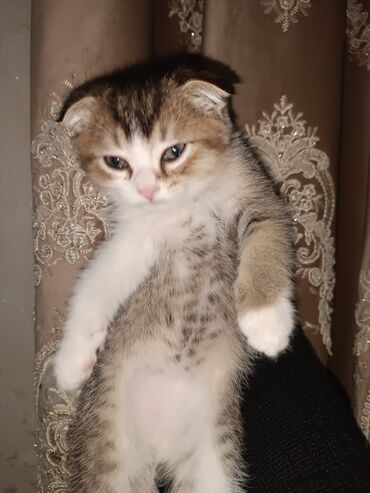 Şotland qıvrımqulaq (Scottish Fold) pişiyi - Rəng: boz-qəhvəyi tabby (zolaqlı), yumşaq və parlaq tük örtüyü - Qulaqlar: tipik qıvrılmış, başa yaxın - Gözlər: iri, ekspressiv - Bədən quruluşu: komp...