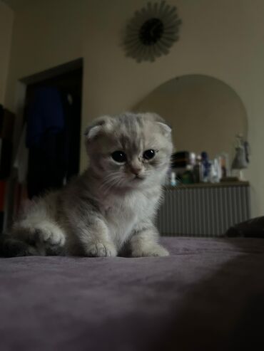 Şotland qıvrım qulaqlı (Scottish Fold) pişik - Cins: Scottish Fold - Qulaqlar: qıvrım - Rəng: krem-boz tonlarda, quyruq ucu tünd - Gözlər: iri, mavi-boz -sakit və mehribandir, erkəkdir, 1 yaş 1 ay...