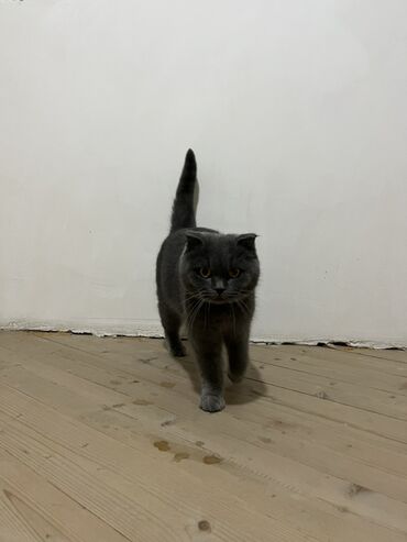 Skottiş Fold (qulaqları qatlanmış) tipli, boz rəngli, qısa tüklü pişik. Məhsulun təsviri: - Rəng: tam bərk boz (blue/grey), parlaq və bərabər ton. - Gözlər: iri, bal rənginə yaxın sarı-qızılı. - Q...