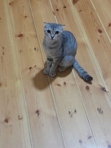 Şotland qıvrımqulaq (Scottish Fold) pişiyi - Rəng: Boz-gümüş tabby, yumşaq qısa tüklü - Qulaqlar: Klassik qıvrılmış, başa yaxın - Gözlər: Sarı-qızılı, ifadəli - Xüsusiyyətlər: Sakit və mehriban xa...