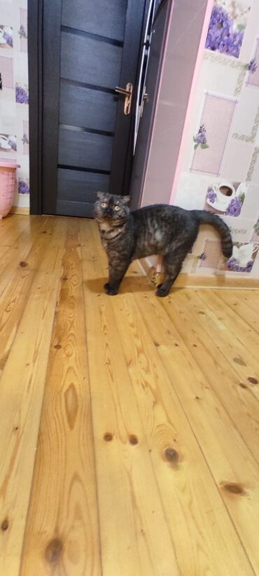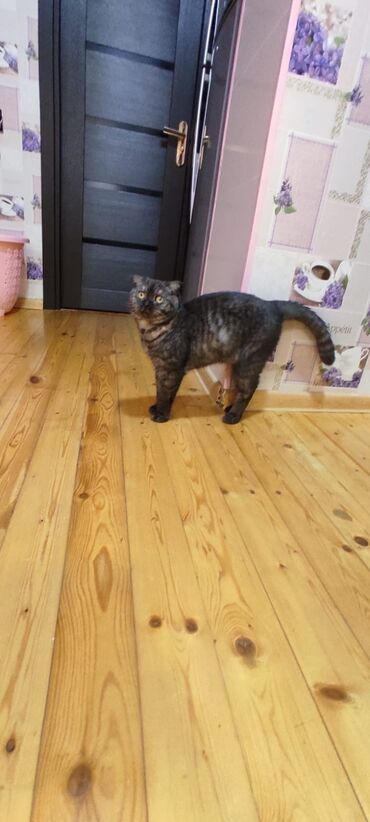 Skotiş tipli qısa tüklü boz pişik - Xüsusiyyətlər: Yumşaq, sıx boz tük örtüyü, qıvrıq/qatlanmış qulaqlar, iri sarı gözlər. - Xarakter: Sakit və mehriban, ev şəraitinə uyğun. İnsanlarla ünsiyyəti s...