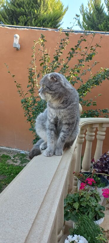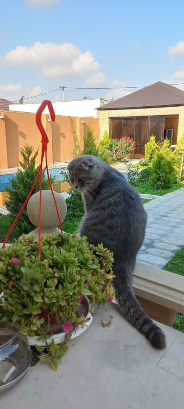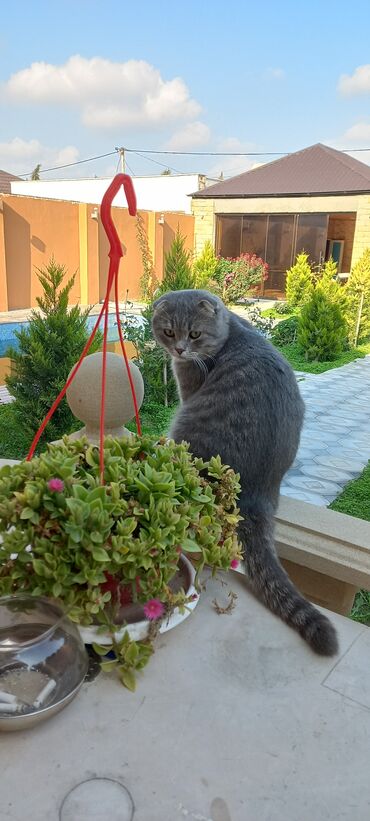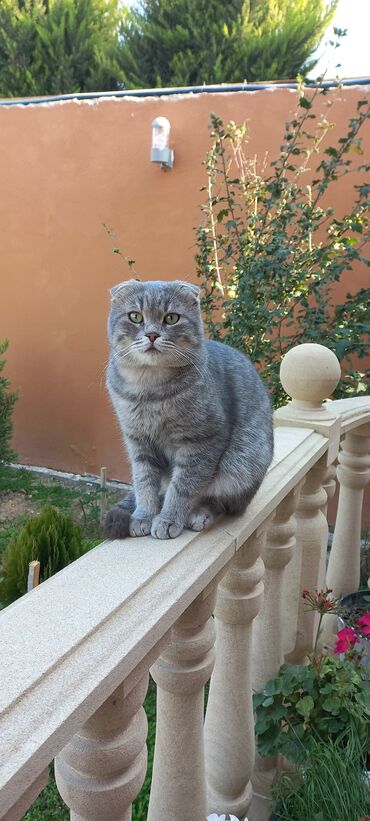 Skotiş tipli qısa tüklü boz pişik - Xüsusiyyətlər: Yumşaq, sıx boz tük örtüyü, qıvrıq/qatlanmış qulaqlar, iri sarı gözlər. - Xarakter: Sakit və mehriban, ev şəraitinə uyğun. İnsanlarla ünsiyyəti s...
