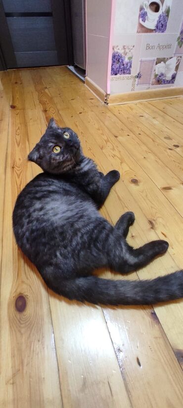 Britaniya qıvrımqulaq (Scottish Fold tipli) görünüşlü, tünd boz (grafit) rəngdə ev pişiyi 1 yaṣi var peyvendide olunub vitaminleride verilir. Qıvrılmış, yumru qulaqlar, iri qızılı-göy qurşağı tonl...