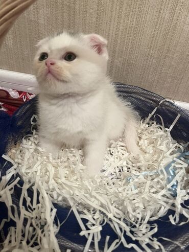 Sahibləndirilir. 1 yaş 20 günlük pişik balası. Anası Anqora, atası Şotland (əyrıqulaq). Yemək yeyir, qum tərbiyəsi var. Xüsusiyyətlər: - Rəng: ağ tüklü, başında tünd ləkəli naxış - Qısa quyruq, yu...