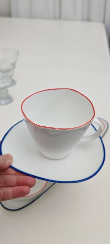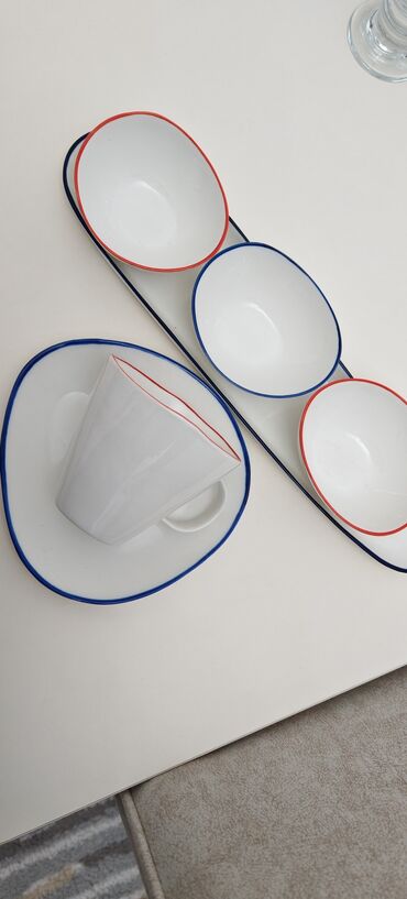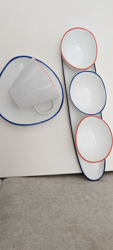 - Dizayn: qeyri-bərabər (organik) forma; incə kənar haşiyələr – kasalarda qırmızı və mavi, boşqab və fincanaltıda mavi, fincanda qırmızı haşiyə