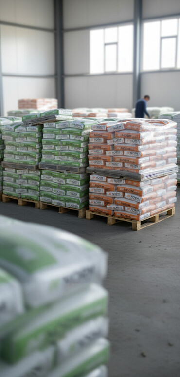 .NORM markalı sement kisələri müxtəlif layihələr üçün etibarlı tikinti materialıdır. Şəkildə iki növ sement görünür: biri "KLASS A" olaraq müəyyən edilə bilən yaşıl qablaşdırmada, digəri isə "KLASS B" olaraq görünən narıncı qablaşdırmadadır. Bu sement növləri müxtəlif tikinti ehtiyaclarına uyğun olaraq istifadə oluna bilər. Məhsullar paletlərdə səliqəli şəkildə yığılmışdır ki, bu da onları daşımaq və saxlamaq üçün əlverişlidir. Bu sement kisələri möhkəm və davamlı tikinti işləri üçün ideal seçimdir.