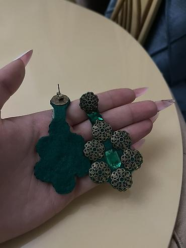 Zərif qadın sırğaları – oval formada yaşıl (smaragd tonlarında) daşlı model. Hər sırğanın mərkəzində parlaq cilalanmış iri yaşıl daş yerləşir, ətrafı isə xırda şəffaf kristallarla çərçivələnib. Met...