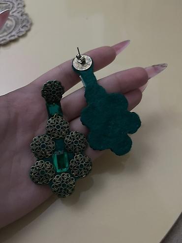 Bohem üslubunda asma sırğalar - Material: metal ərinti, qarmaq tipli asqı. - Rənglər: gümüş tonlu korpus, mərkəzdə iri zümrüd-yaşıl kvadrat daş effektli element. - Dizayn: dairəvi açıq naxışlı çər...