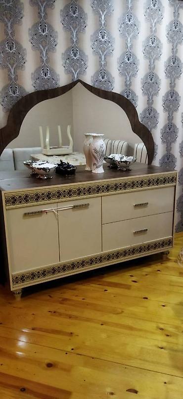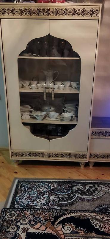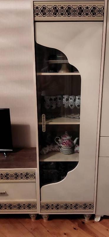 Qonaq otağı üçün çoxfunksiyalı TV stendi və vitrin dəsti - Material: ağac teksturalı laminat (qəhvəyi) + krem rəngli fasadlar, şüşə vitrin qapıları, metal tutacaqlar - Komplekt tərkibi: • Mərkəz...