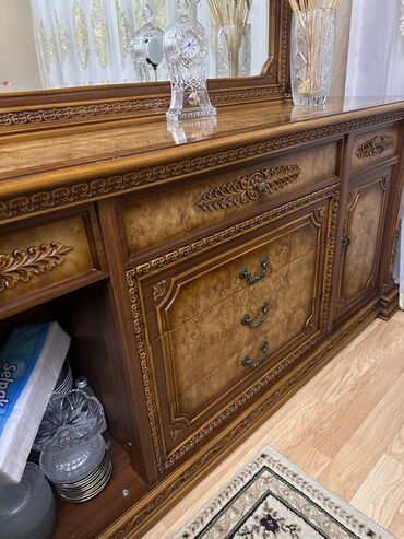 Şabalıd ağacdan hazırlanmış böyük bufet və güzgü dəsti. Xüsusiyyətlər: - Material: təbii ağac (klassik qəhvəyi rəng, laklı səth) - Üslub: klassik, əl oyma dekorativ haşiyələr və karnizlər - Komple...