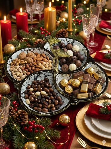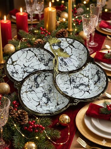 - Rənglər və tamamlanma: Parlaq səth, qızılı akssentlər ilə şık bayram masasina uyğun