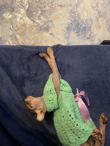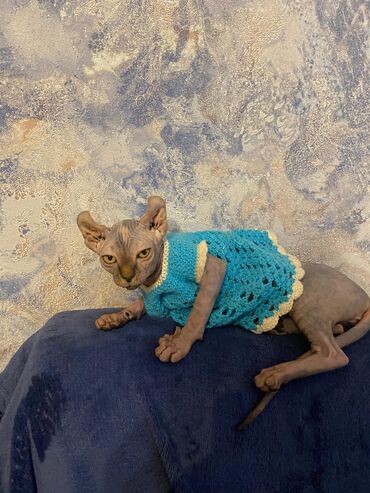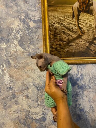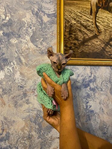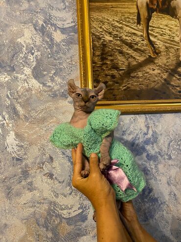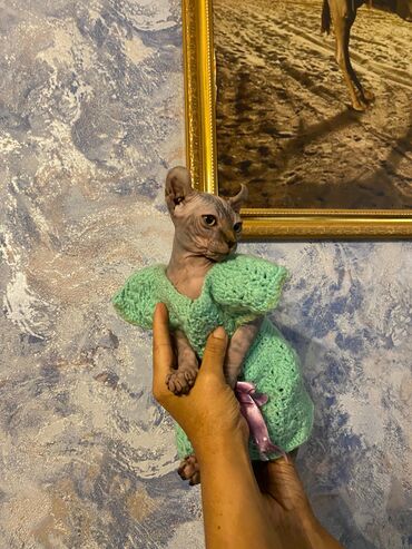- Ölçü: şəkillərdə sfenks pişikdə göstərilib – ölçüsü yığcam/orta bədənli tüksüz pişik cinslərinə uyğundur