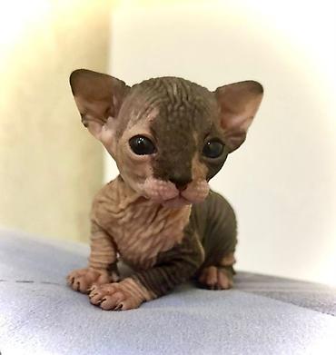 Kanada Sfenks pişik balaları - Cins: Kanada Sfenks (tüklüsüz) - Rəng: boz/mavi çalarlar, açıq mavi-yaşıl gözlər - Qulaqlar böyük, bədən quruluşu möhkəm, dəridə tipik qırışlar - Xasiyyət: mehriban...