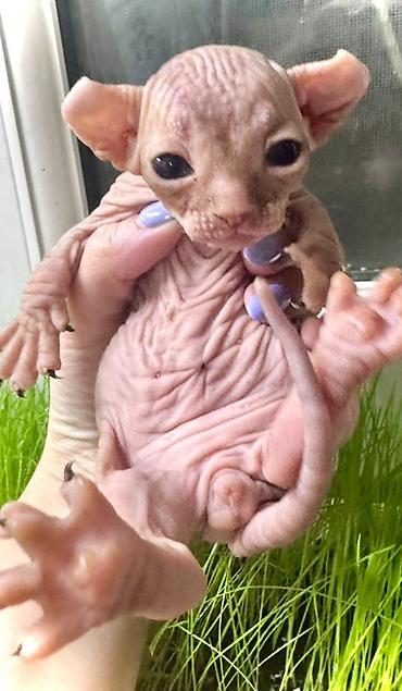 Yeni doğulmuş pişik balaları – tüksüz (Sfinqs tipli) görünüşlü balalar. Xüsusiyyətlər: - Tüksüz bədən quruluşu, bürünc/çəhrayı tonlarda dəri - Yaxın təmas və qayğıya həssas, insanla ünsiyyəti sevə...