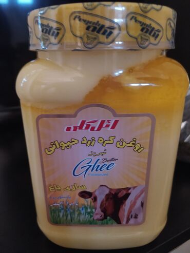 • Qab: bankada, üzərində farsca “heyvani sarı yağ” yazısı və inək təsviri.