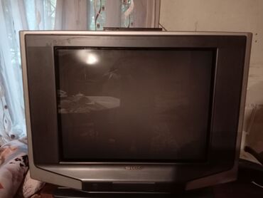 Kompakt kineskop (CRT) televizor - Ekran: təxminən 21–25 düym diaqonal, düz ön panel - Korpus rəngi: gümüşü/boz - Üst hissədə havalandırma ızgaraları, arxa tərəfdə çıxıntılı kineskop - Ön paneldə ...