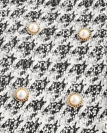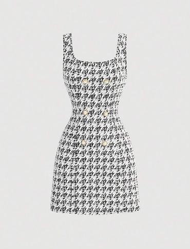 Qadın mini don – qara-ağ “houndstooth” naxışlı, qolsuz, kvadrat dekolteli. Bədən xəttini vurğulayan,belə oturan siluet. Ön hissədə ikicərgə dekorativ düymələr: mirvari effektli başlıq və qızılı haşiyə. Arxa hissə sadə, naxış davamlıdır. Parça toxumalı/bukle effekti ilə qalın strukturludur, formanı saxlayır. Dizayn klassik və zərif üslubu birləşdirir: ofis, iş görüşü, şəhər şıklığı və axşam çıxışı üçün uyğundur. Aksesuarlarla (qara topuqlu ayaqqabı, zərif çanta, qızılı bəzəklər) asanlıqla kombinlənir. Rəng: qara-ağ. Uzunluq: mini. Detal: 4 ədəd dekorativ mirvari düymə ön hissədə.