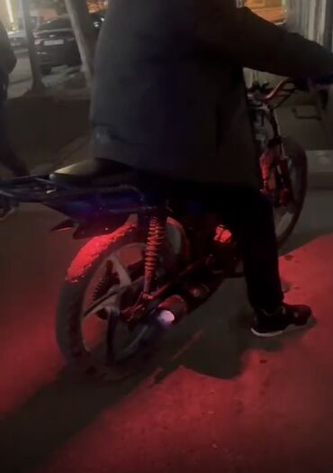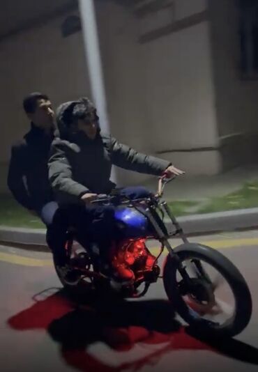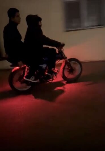 Kompakt şəhər motosikleti – mavi gövdə və çərçivə altında dekorativ qırmızı LED işıqlandırma ilə.