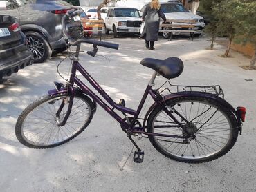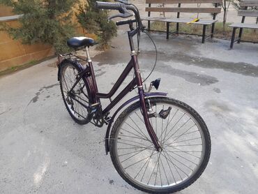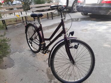 Şəhər tipli velosiped – bənövşəyi rəngdə, klassik “step-through” (aşağı çərçivə) gövdə.