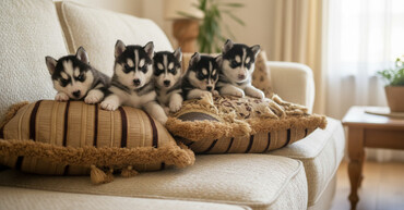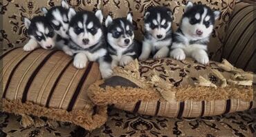 Şəkildə eyni zibil qrupundan olan, sağlam görünüşlü, sevimli Husky balaları təsvir olunub. Enerjili, idmansevər və ailəyə sadiq ev heyvanı axtaranlar üçün əla seçimdir.