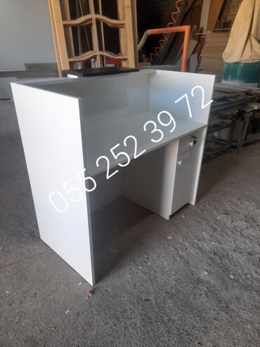 Müasir giriş konsolu / resepsiyon stendi - Dizayn: İki səviyyəli L formalı masa. Üst səthlər açıq rəngli ağac teksturalıdır, korpus isə ağ rəngdədir. Səliqəli, minimal xətlər və yumşaq radiuslu kü...
