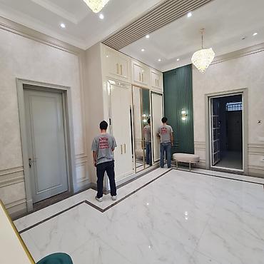 - Zərif klassik-modern dizayn: tavana qədər hündür qarderob sistemləri, güzgülü və şüşəli fasadlar, qızılı/profilli dekor, gizli və açıq tutacaqlar