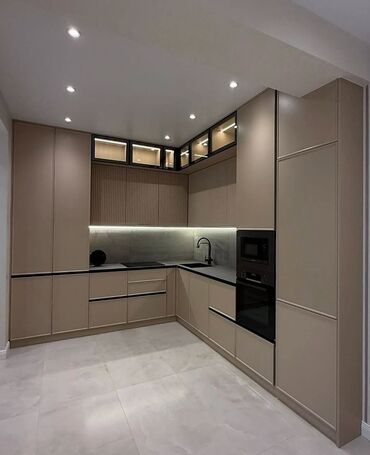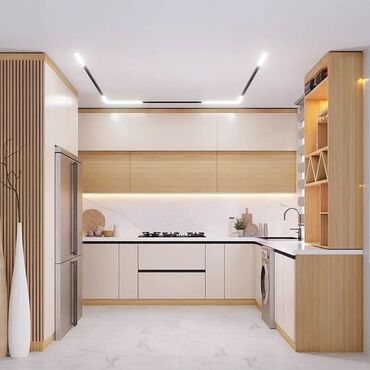 - Materiallar: MDF/Laminate fasadlar, ağac teksturalı panellər, şüşə vitrinlər, daş/kompozit iş masasının variantları